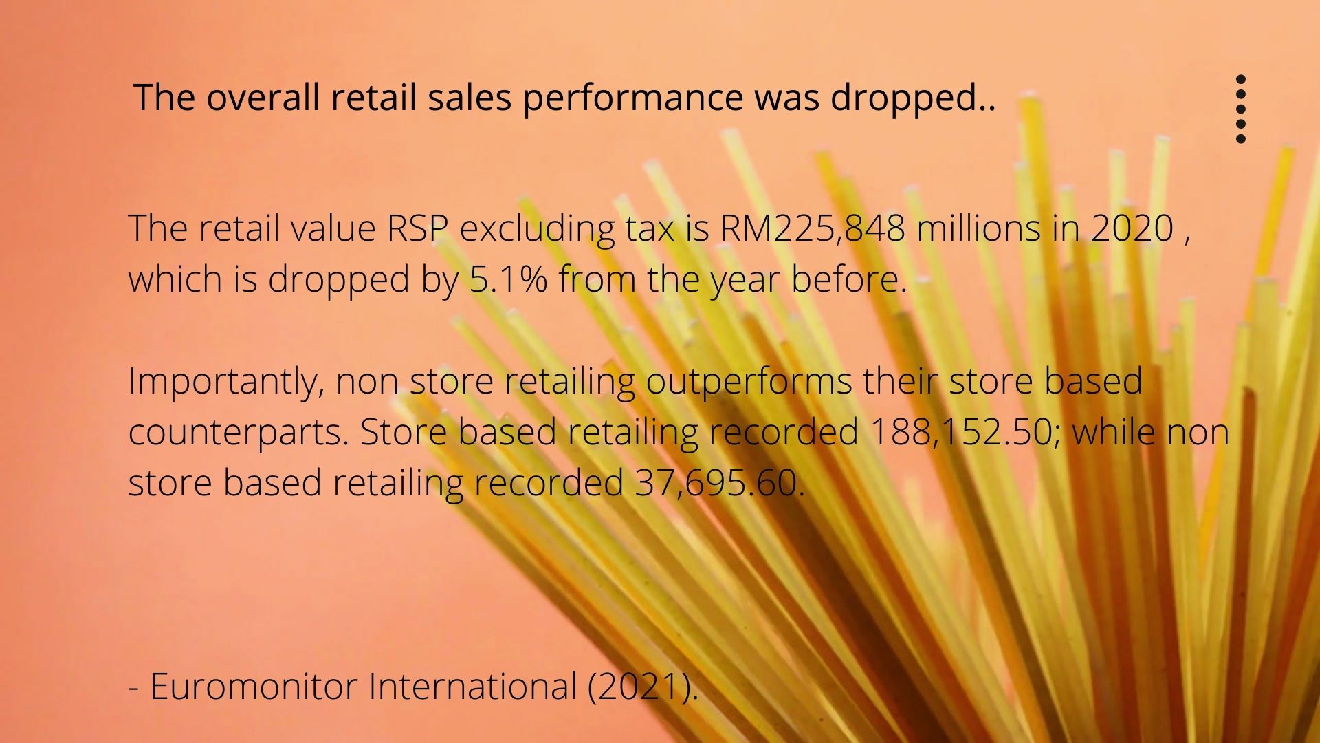 The presentation slides detail the grocery retailing in Malaysia during the Covid-19 pandemic. The impacts of the pandemic as well as how do the customers and retailers adapt and change accordingly to the pandemic.
