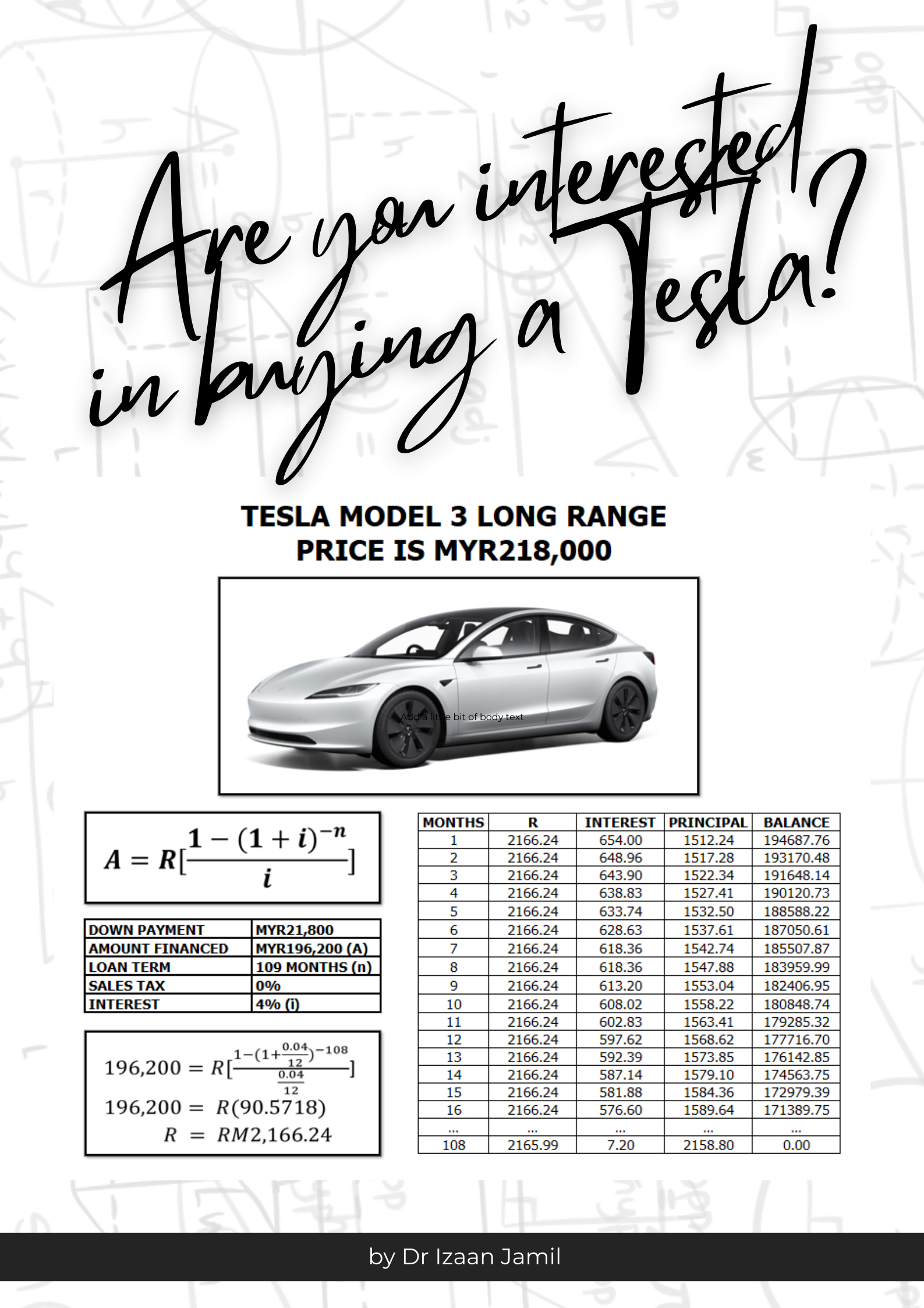 The amortization method in Business Mathematics can help you to figure out how much you have to pay each month for Tesla.