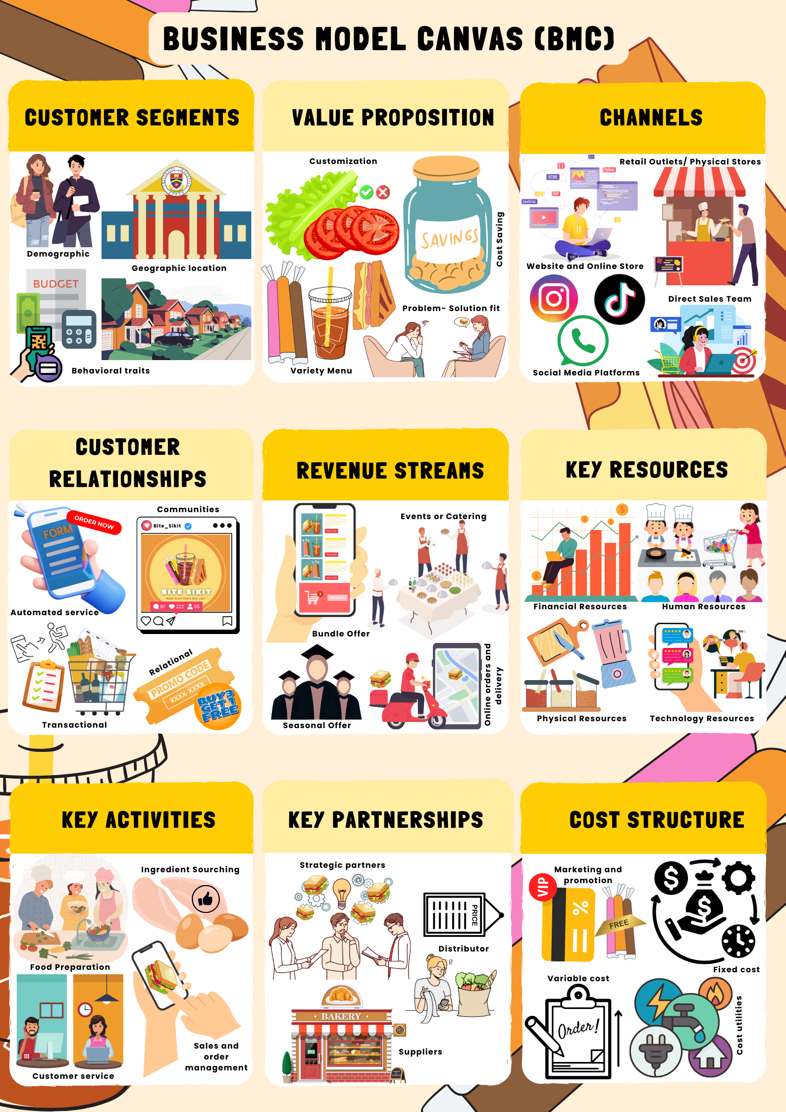 This Business Model Canvas (BMC) poster highlights the core components of a business strategy for a food-related enterprise. It identifies key customer segments, including demographics, geographic locations, and behavioral traits, while emphasizing a strong value proposition through customization, cost savings, and variety in offerings. The channels for engagement include physical outlets, online platforms, and social media to ensure customer outreach. Additionally, the model focuses on fostering customer relationships through automated, transactional, and relational services. The revenue streams encompass catering, seasonal offers, and bundle packages, supported by key resources such as financial, human, and technological assets. Crucial activities include ingredient sourcing, food preparation, and customer service, while strategic partnerships with suppliers and distributors streamline operations. Lastly, the cost structure balances variable and fixed expenses to ensure profitability.